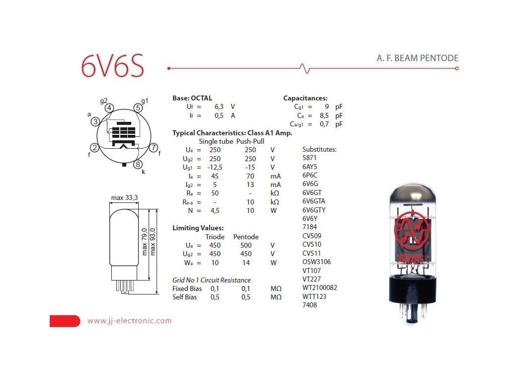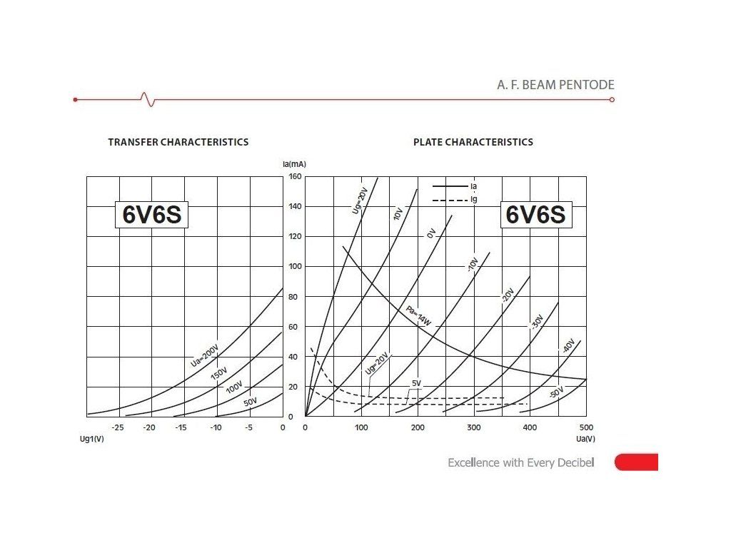Lampa 6V6S určená pro sekci koncového zesilovače lampových aparátů, vhodná pro všechny značky zesilovačů s osazením elektronek typu 6V6S. Lampa vyniká silnými středovými frekvencemi a jasnými výškami, zvuk doplňují solidní basy.
